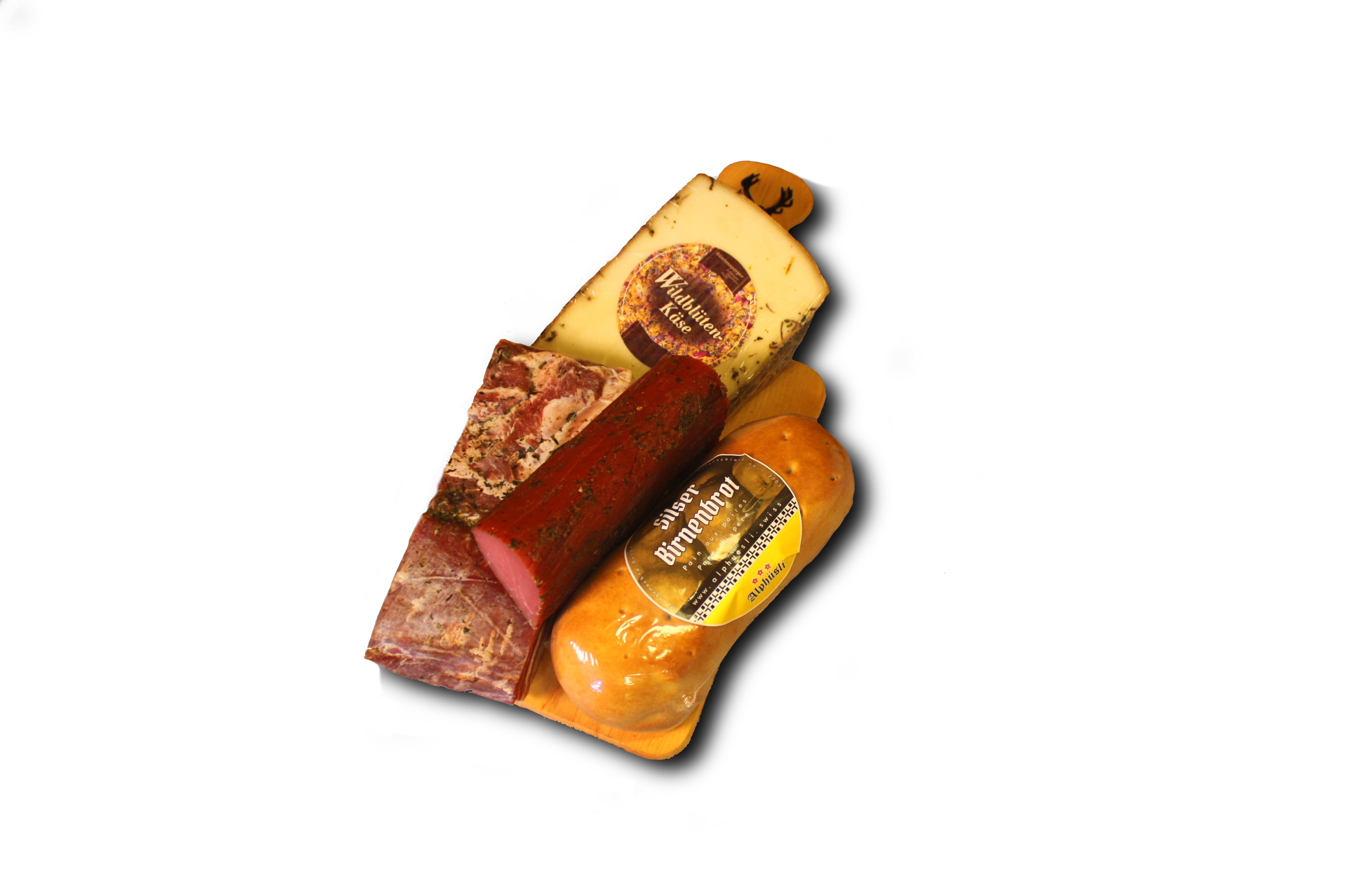 Geschenkbrettli, Wildblütenkäse, Kräuterspeck, Alpenfilet, Silser Birnenbrot